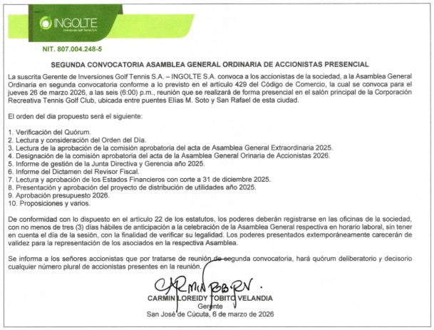 Se informa que el día de hoy estaremos en el salón Cúcuta Dos de la Corporación Recreativa Tennis Golf Club, en el horario de 8:00 a.m. a 12:00 m., con el fin de recibir los poderes correspondientes a la primera convocatoria de la Asamblea General Ordinaria de Accionistas, programada para el 5 de marzo de 2026.